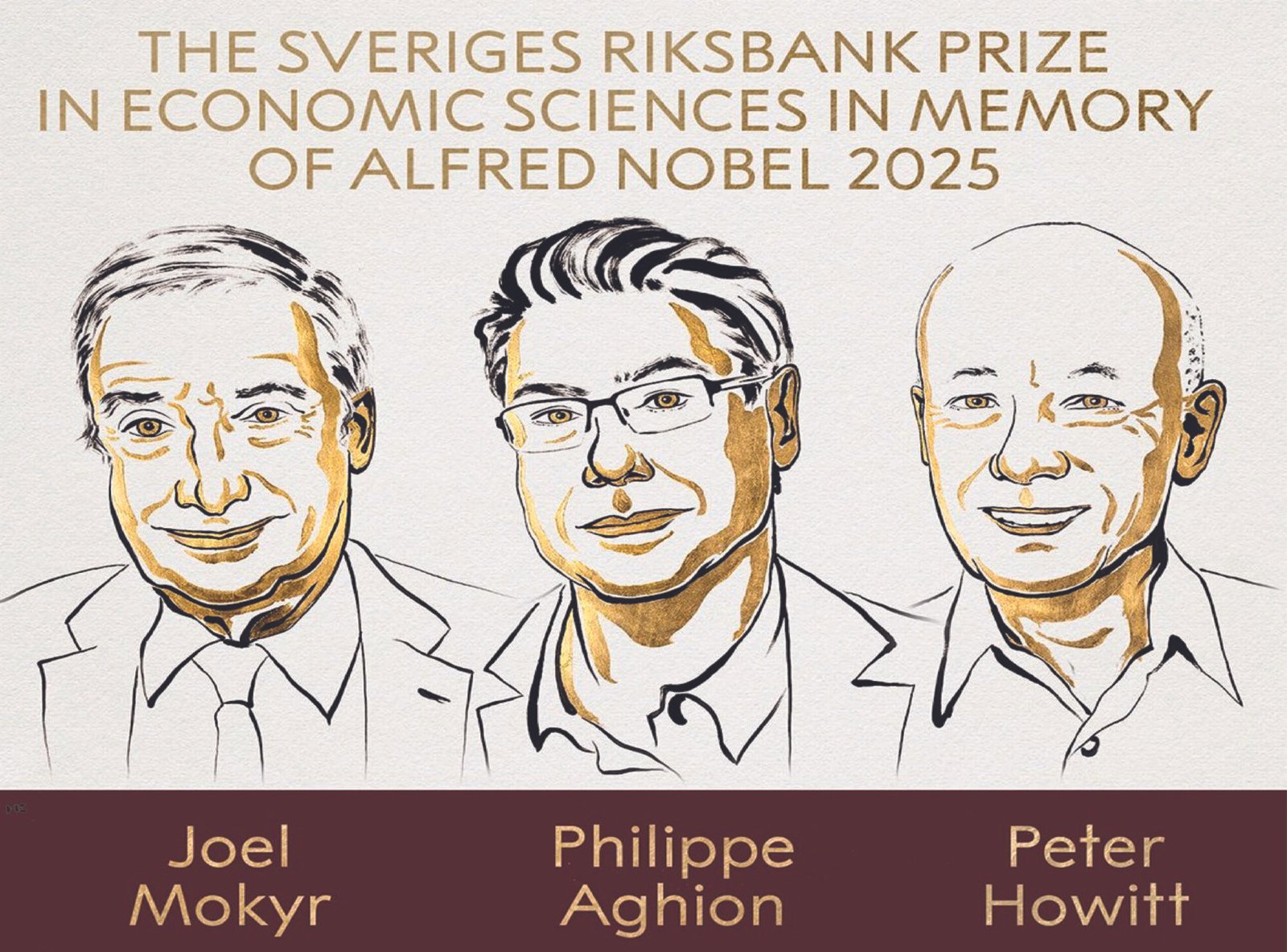 The Royal Swedish Academy of Sciences awarded the 2025 Nobel Prize in Economics to Joel Mokyr (USA), Philippe Aghion (France), and Peter Howitt (Canada) for their pioneering work on the relationship between technology and economic growth.