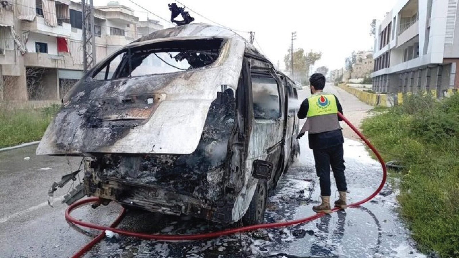 Two paramedics were killed in a drone strike by Israeli forces targeting the town of Haris in southern Lebanon, while a religious hall (Husseiniya) was destroyed in Ansariyeh without reported injuries.