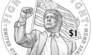 One of the proposed designs features Trump’s portrait on the coin’s obverse, while the reverse shows him raising his fist before an American flag, alongside the phrase “Fight, Fight, Fight.”